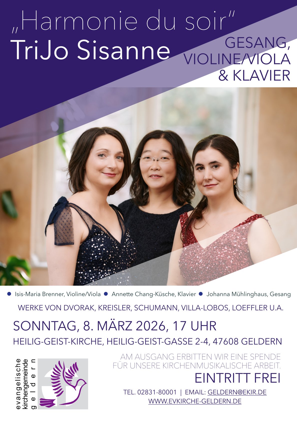 Das „TriJo Sisanne“, bestehend aus der in Geldern geborenen und aufgewachsenen Pianistin Annette Chang-Küsche, der Geigerin/Bratschistin Isis-Maria Brenner und der Sopranistin Johanna Mühlinghaus, lädt die Hörer*innen zu einer akustischen Erlebniswelt mit Werken von Dvorak, Kreisler, Schumann, Villa-Lobos, Loeffler und anderen Komponisten ein.